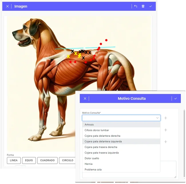 El área de historial clínico y anamnesis está desarrollada sobre la anatomía canina: intuitivo, flexible y visual para llevar seguimiento y comprobar si se consiguen los objetivos de rehabilitación del animal.